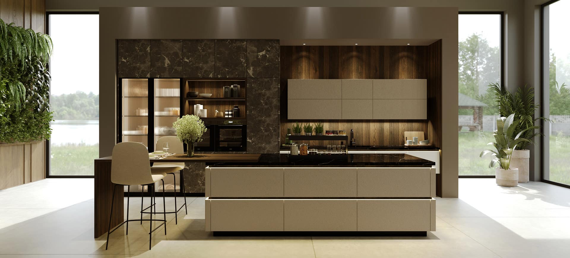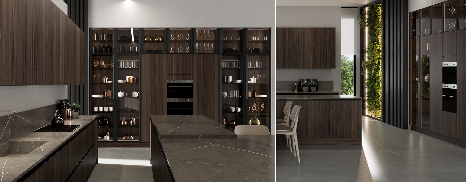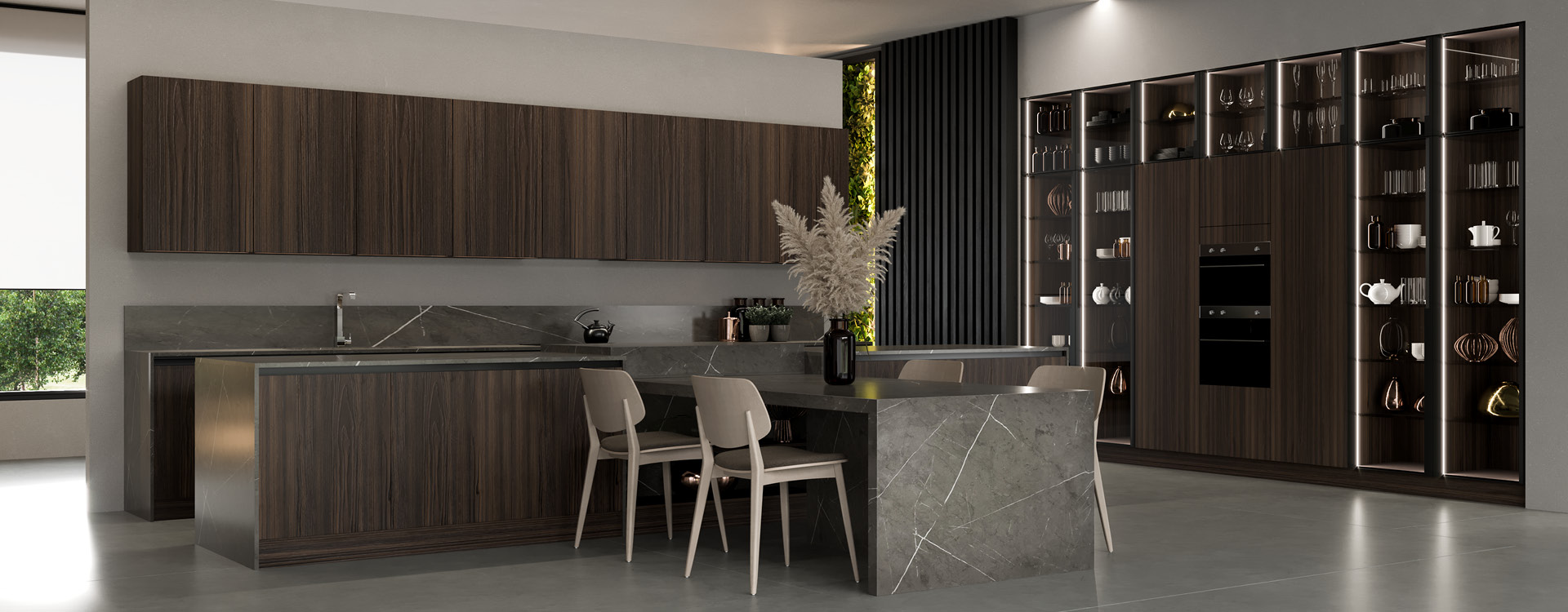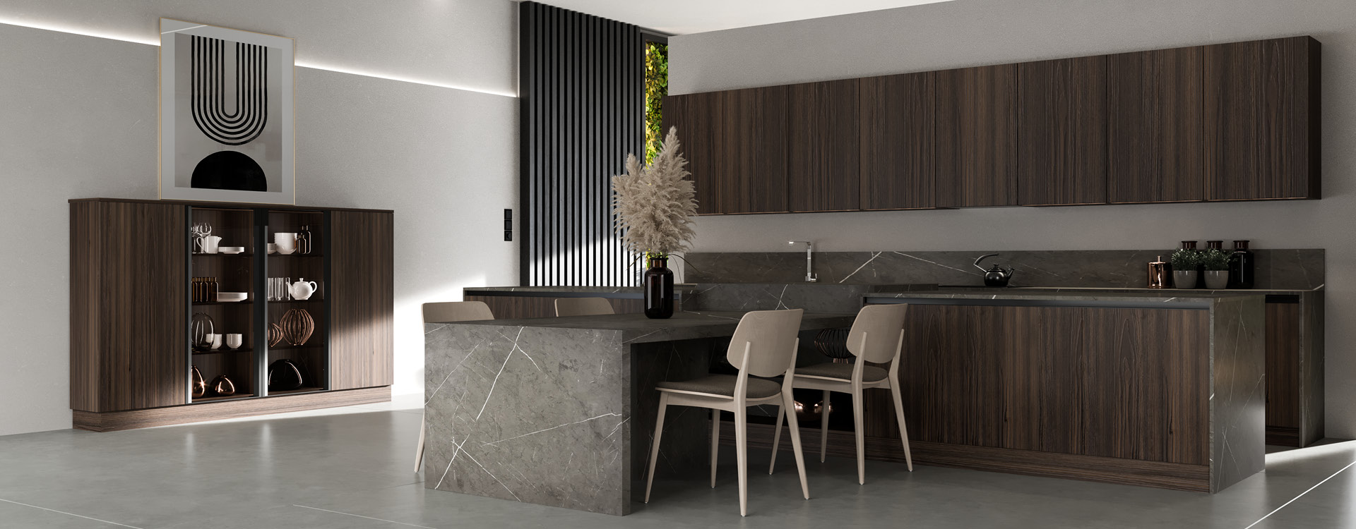 Noka is a luxury kitchen with a timeless appeal! A combination of beautiful finishes such as wood, glass and marble create a high end sleek aesthetic. Matching classic and modern style elements! The shades that have been selected, are dark tones in the color of wood and gray, for a timeless style in the kitchen. With its simple, minimal design, Noka is ideal for large open spaces that will stunningly dominate your space!