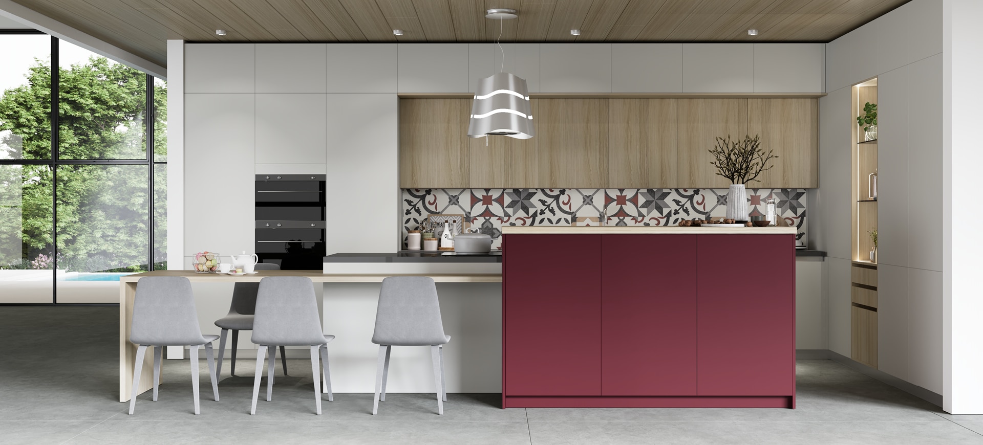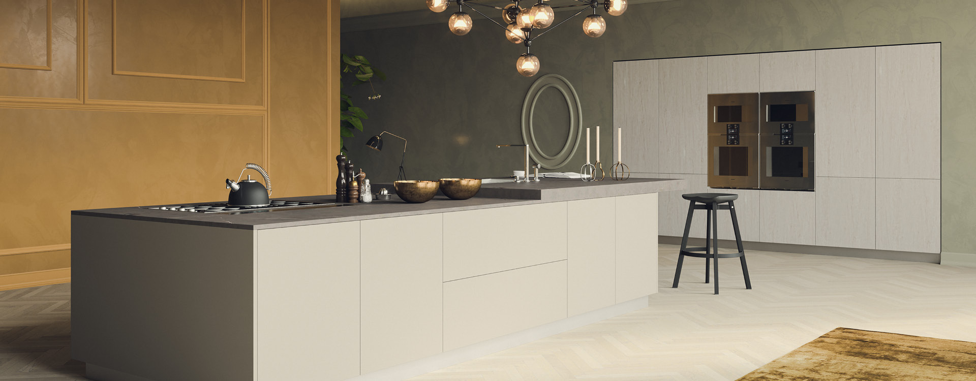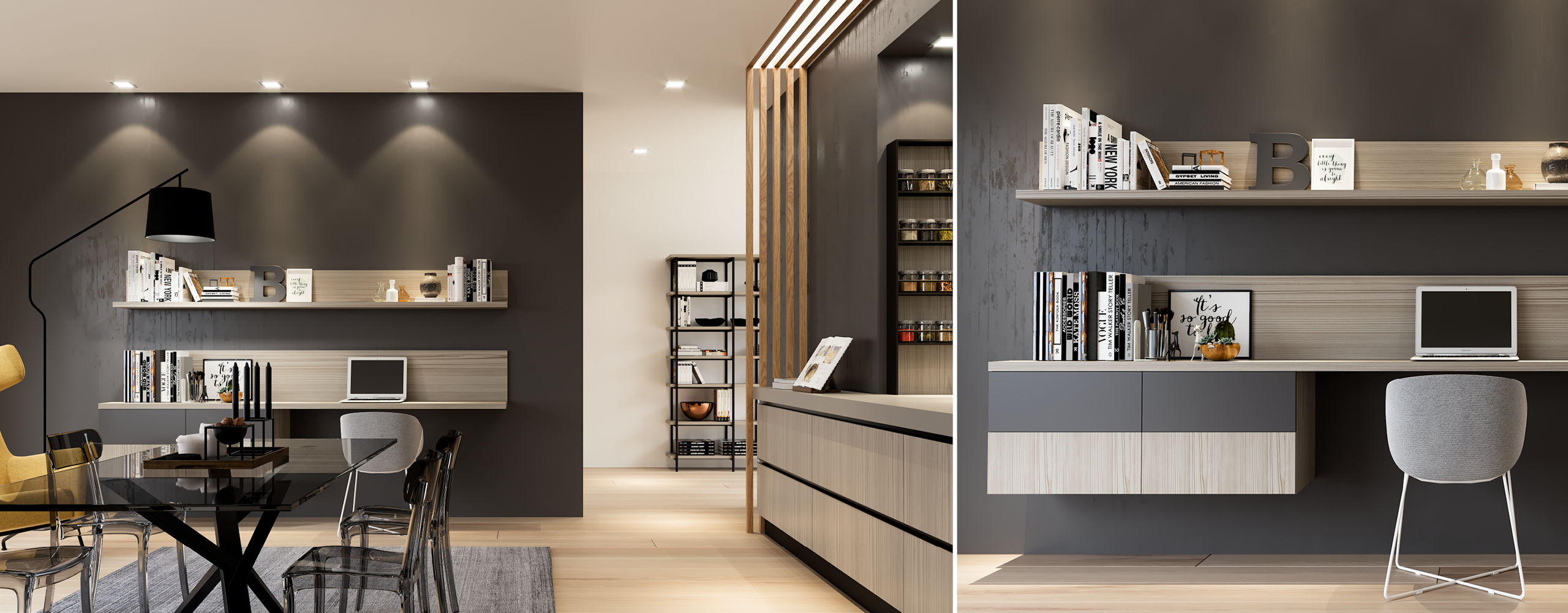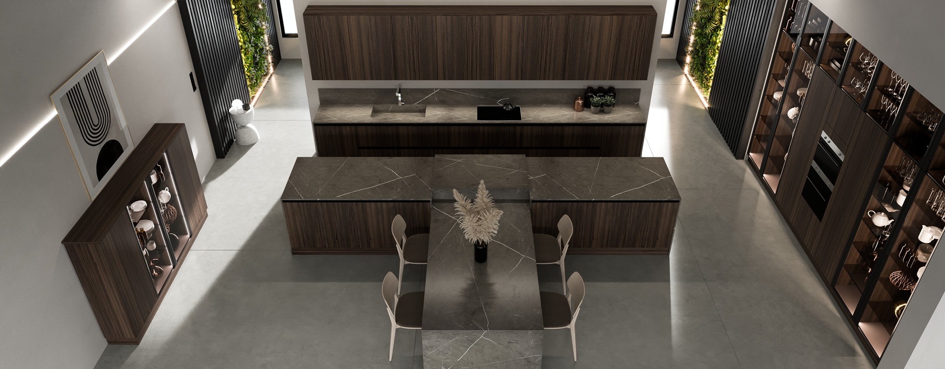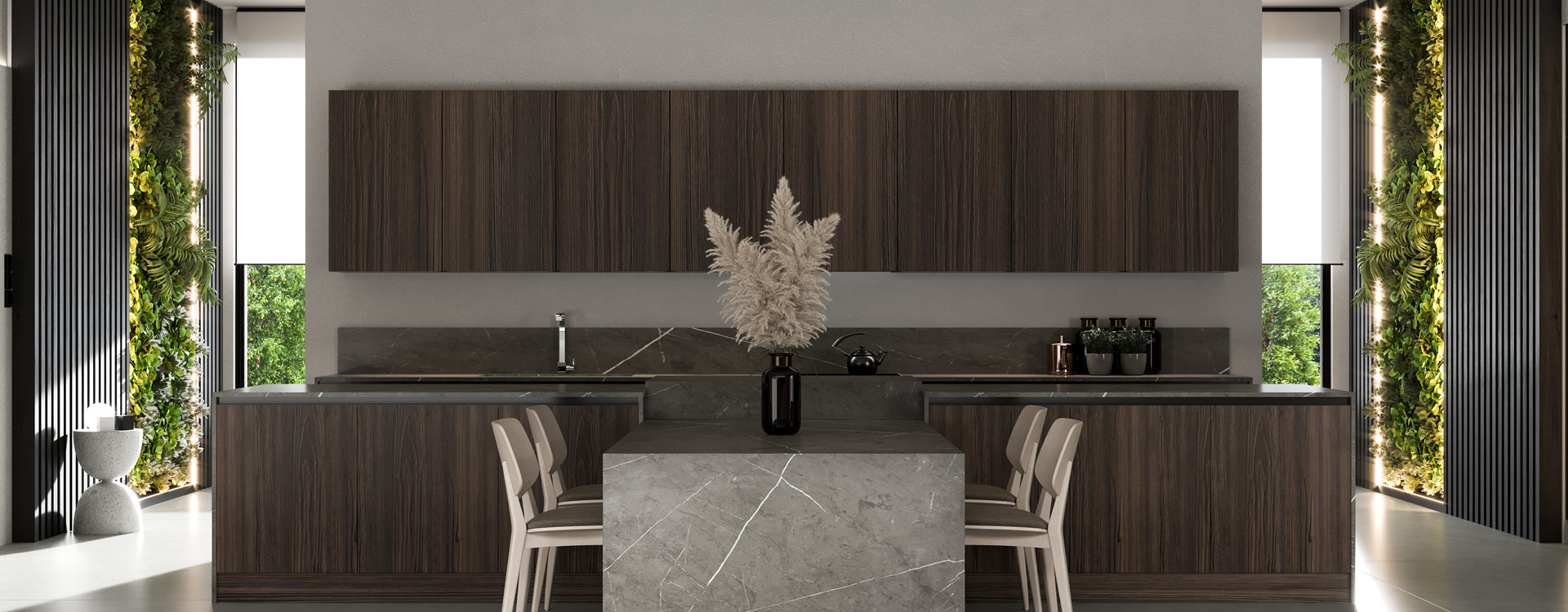 Noka is a luxury kitchen with a timeless appeal! A combination of beautiful finishes such as wood, glass and marble create a high end sleek aesthetic. Matching classic and modern style elements! The shades that have been selected, are dark tones in the color of wood and gray, for a timeless style in the kitchen. With its simple, minimal design, Noka is ideal for large open spaces that will stunningly dominate your space!