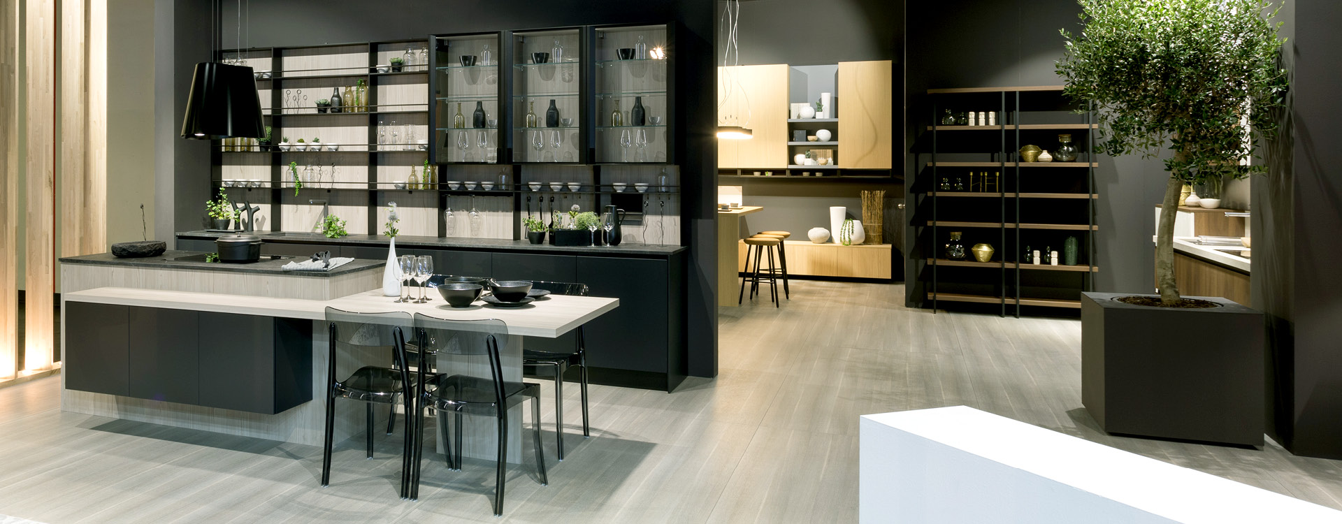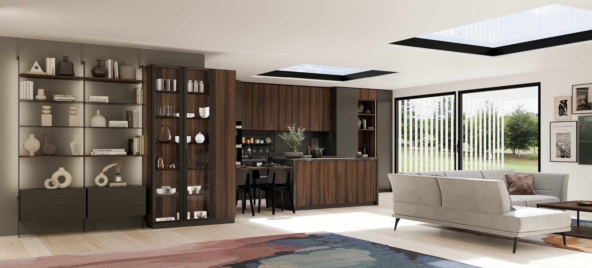 An impressive and very elegant dining table extending the kitchen island, with the same work top finishing forming a “T”. While DORIS chairs add symmetry and absolute harmony to the design! The window display with black frame and interior lighting give special emphasis, further enhancing the look of luxury in you space. Of course, ergonomics and functionality are not lacking.