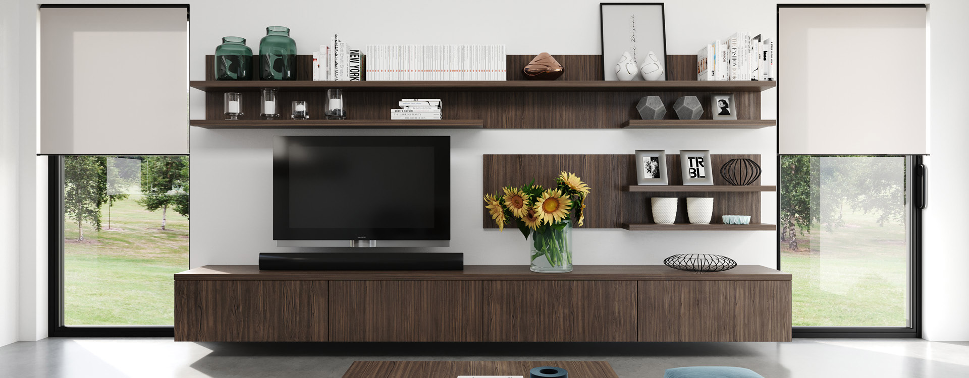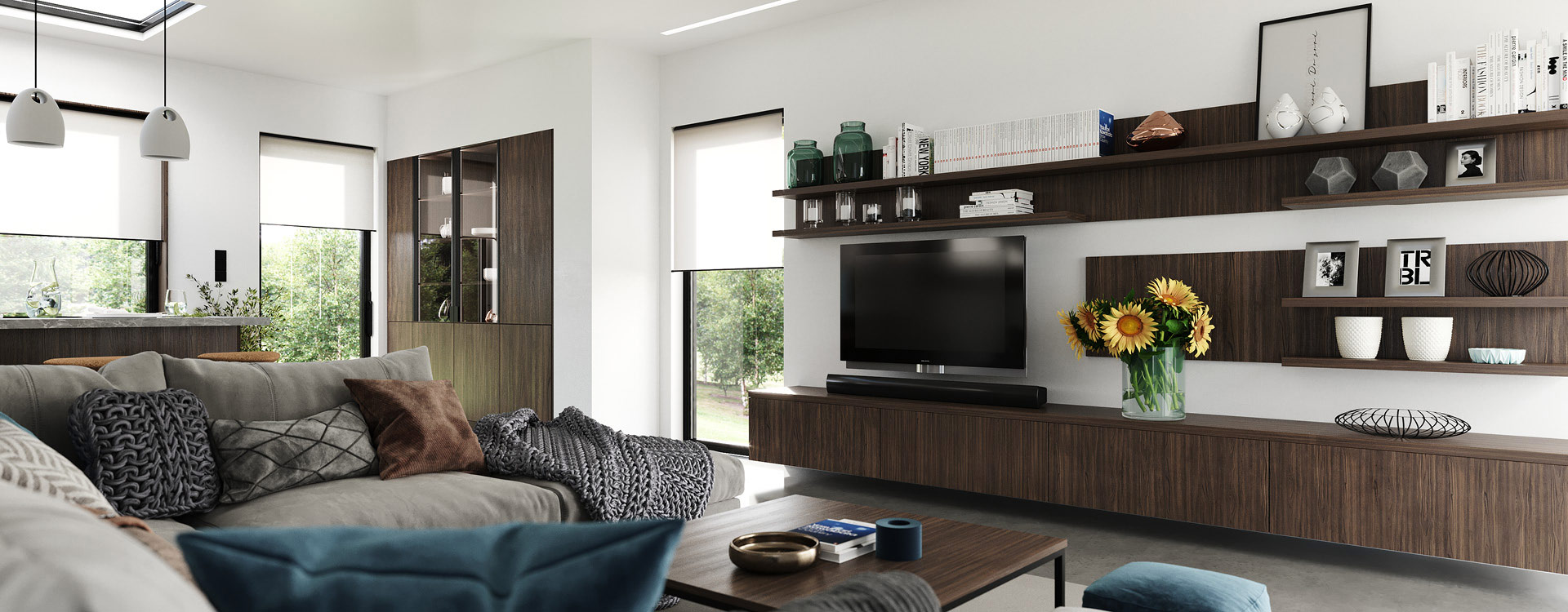 The living room is completed with a light wall composition, mainly with shelves and closed storage spaces, but also a small multi-purpose piece of furniture with glass doors together with doors in the same warm color of wood.