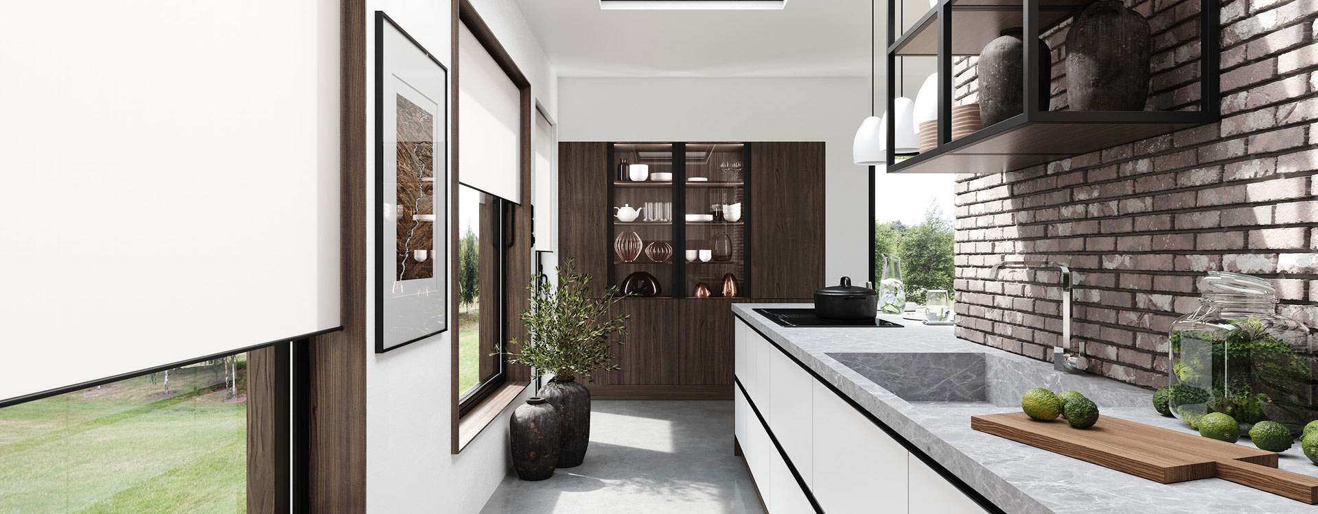 The kitchen is dominated by the color white that gives light, in combination with the wood that gives quality.