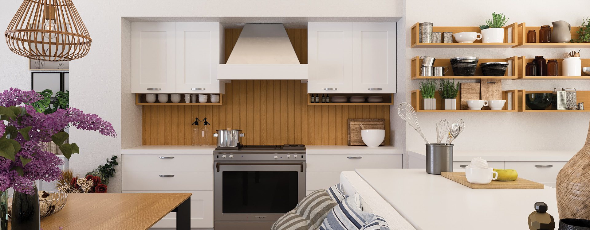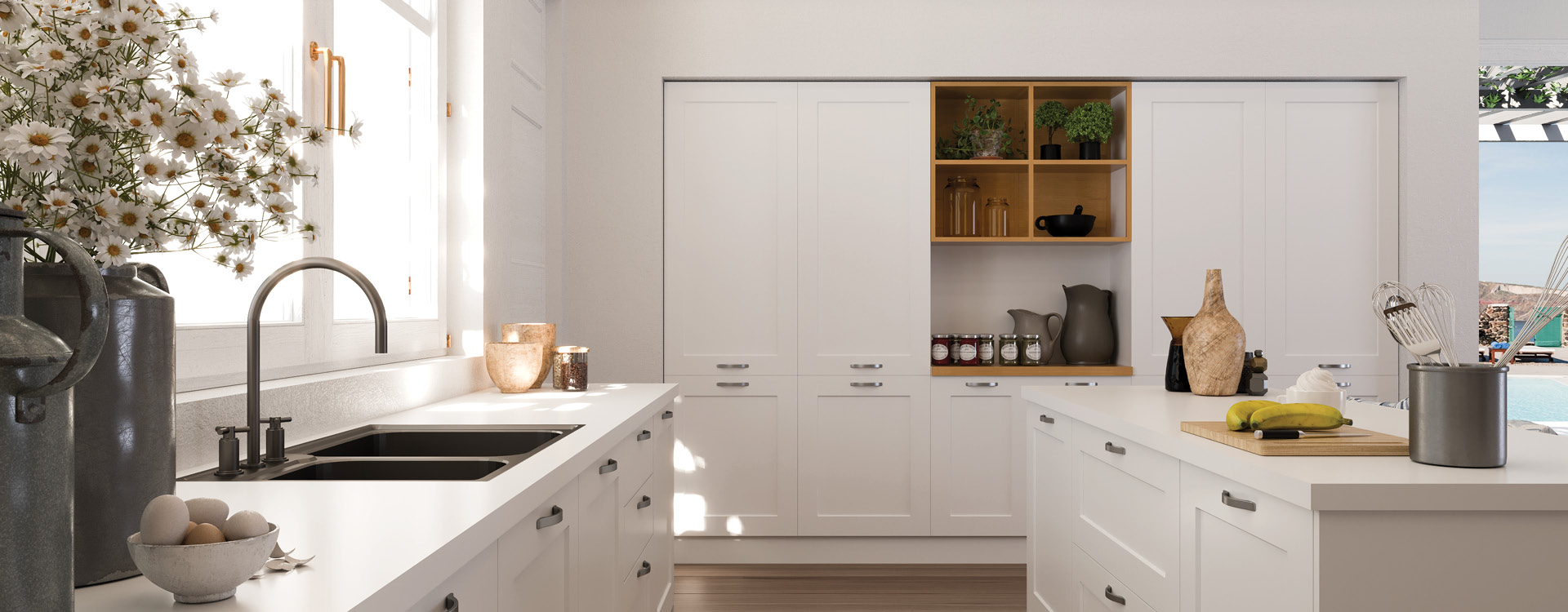 Banoffee is a modern – retro kitchen, with simple lines. The restricted palette makes it easier to unify cabinets, countertops, fixtures and flooring into a cohesive look. The white color dominates in the kitchen, while the light oak natural shades on the shelves and in the wall cladding, illuminate and give a pleasant and warm aura.