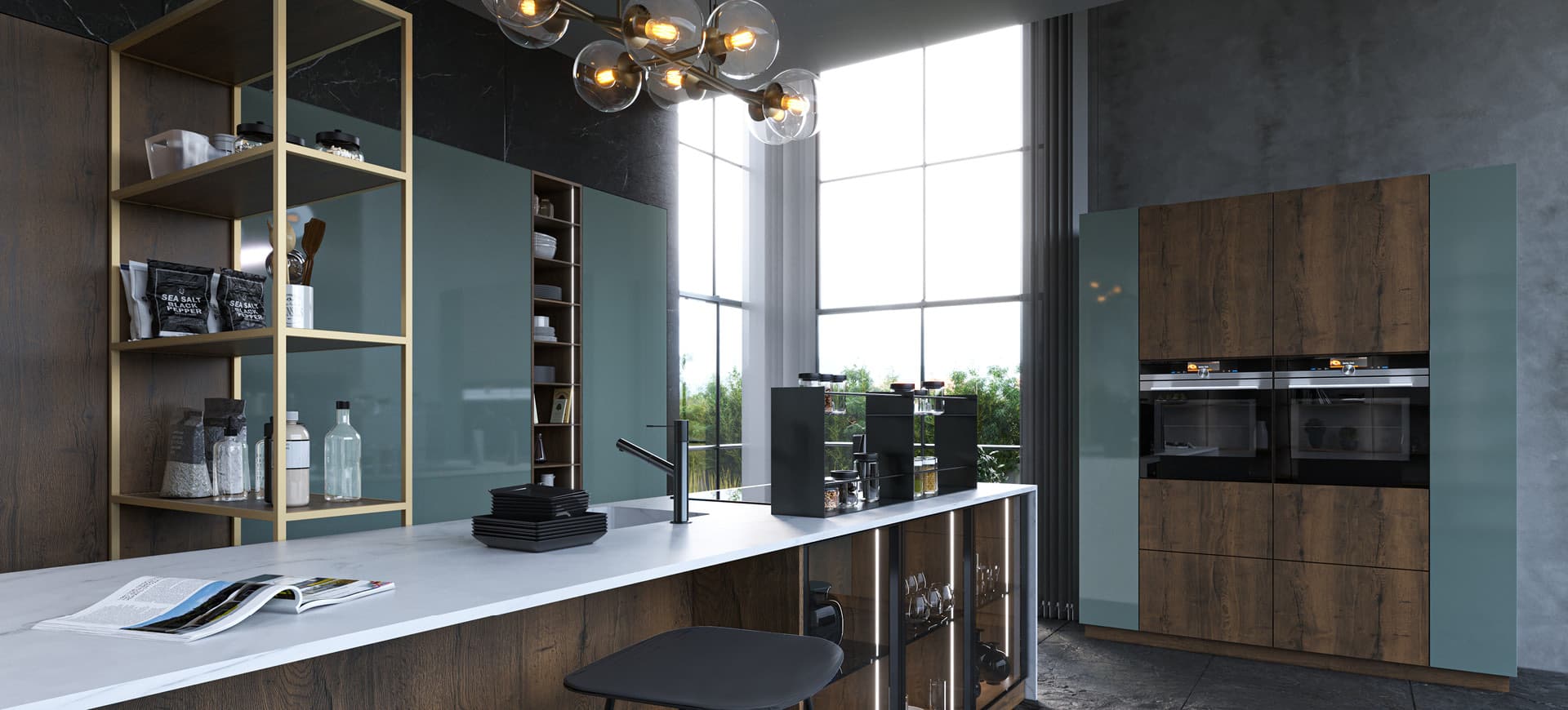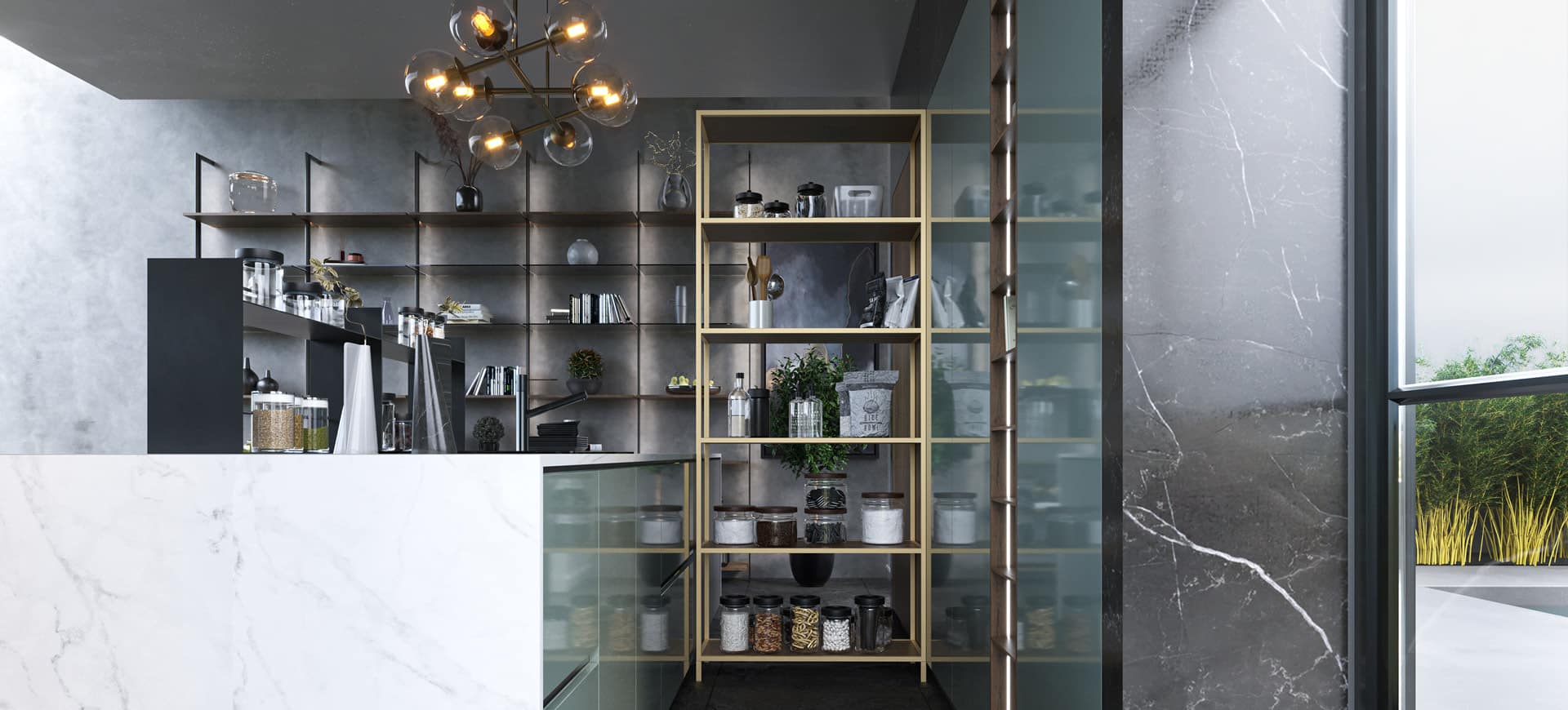 Ici, Une palette sombre qui se fait équilibrer par le blanc dans le comptoir, la lumière dramatique et la lustre : composant ainsi un look très contemporain.