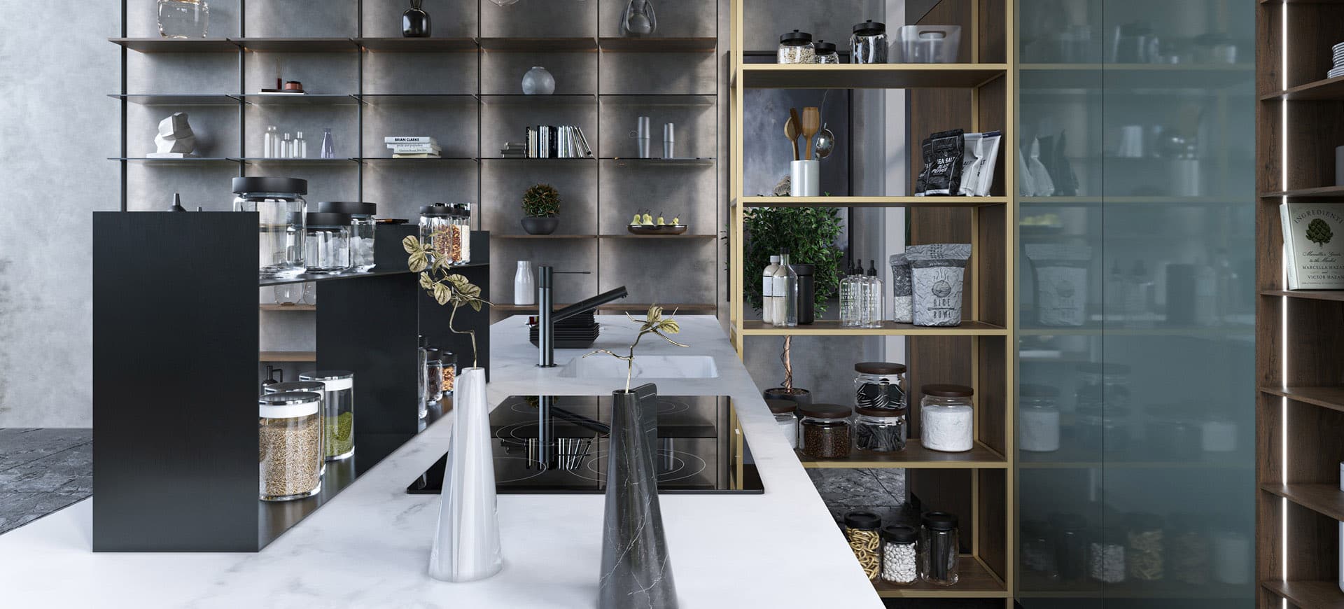 La cuisine Biscotti crée un harmonieux jeux de reflet où les deux éléments absolus sont le verre et la lumière qui donnent de la chaleur à l’espace cuisine.