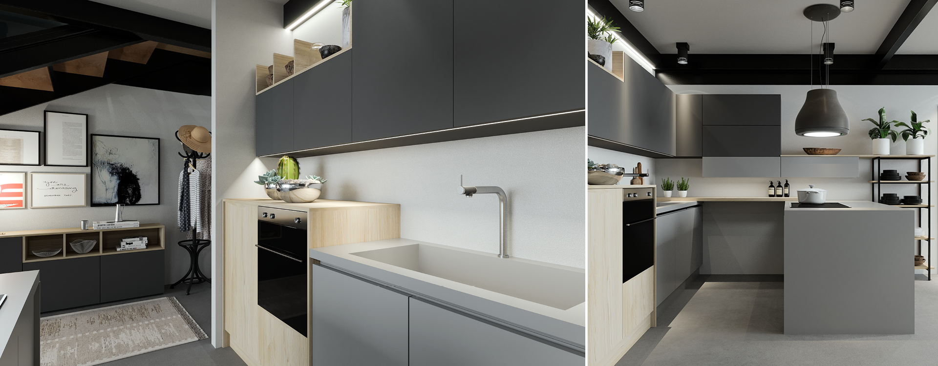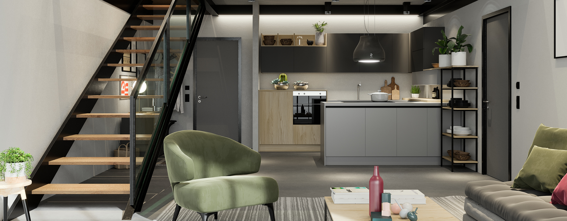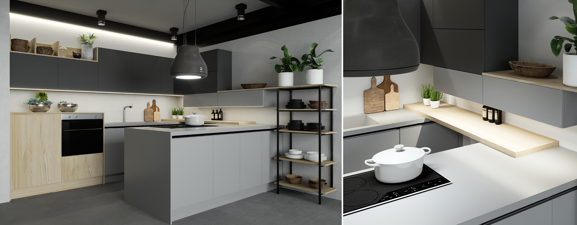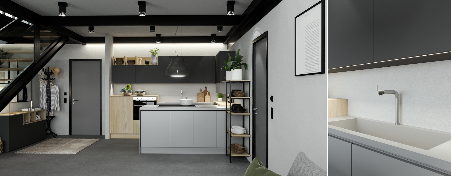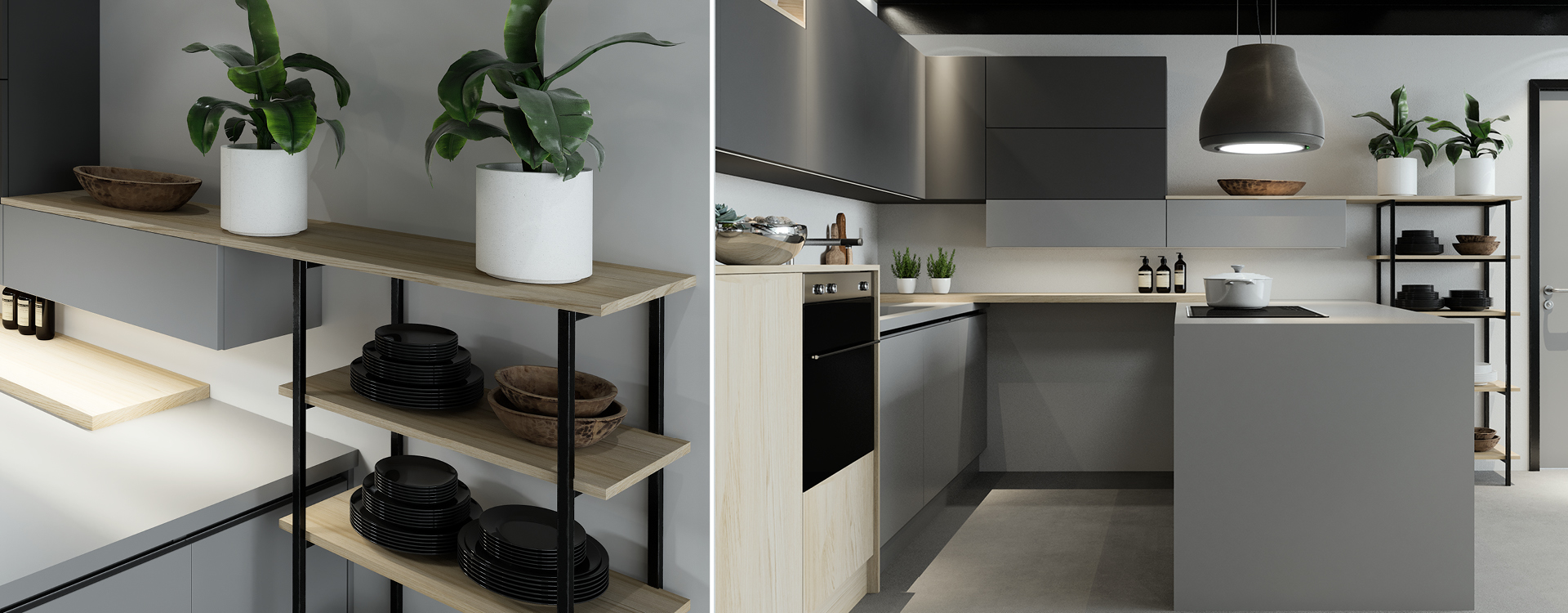 La cuisine Cannoli est petite, aérée, entièrement équipée et idéale pour un studio! La mixte monotone de nuances grises et la touche naturel du bois, se marient parfaitement avec la décoration du salon et de la salle à manger. Des étagères industrielles en métalliques et un meuble d’entrée qui pourrait également servir comme buffet ont été placées parfaitement pour compléter le look tout en offrant des solutions de rangement supplémentaires.