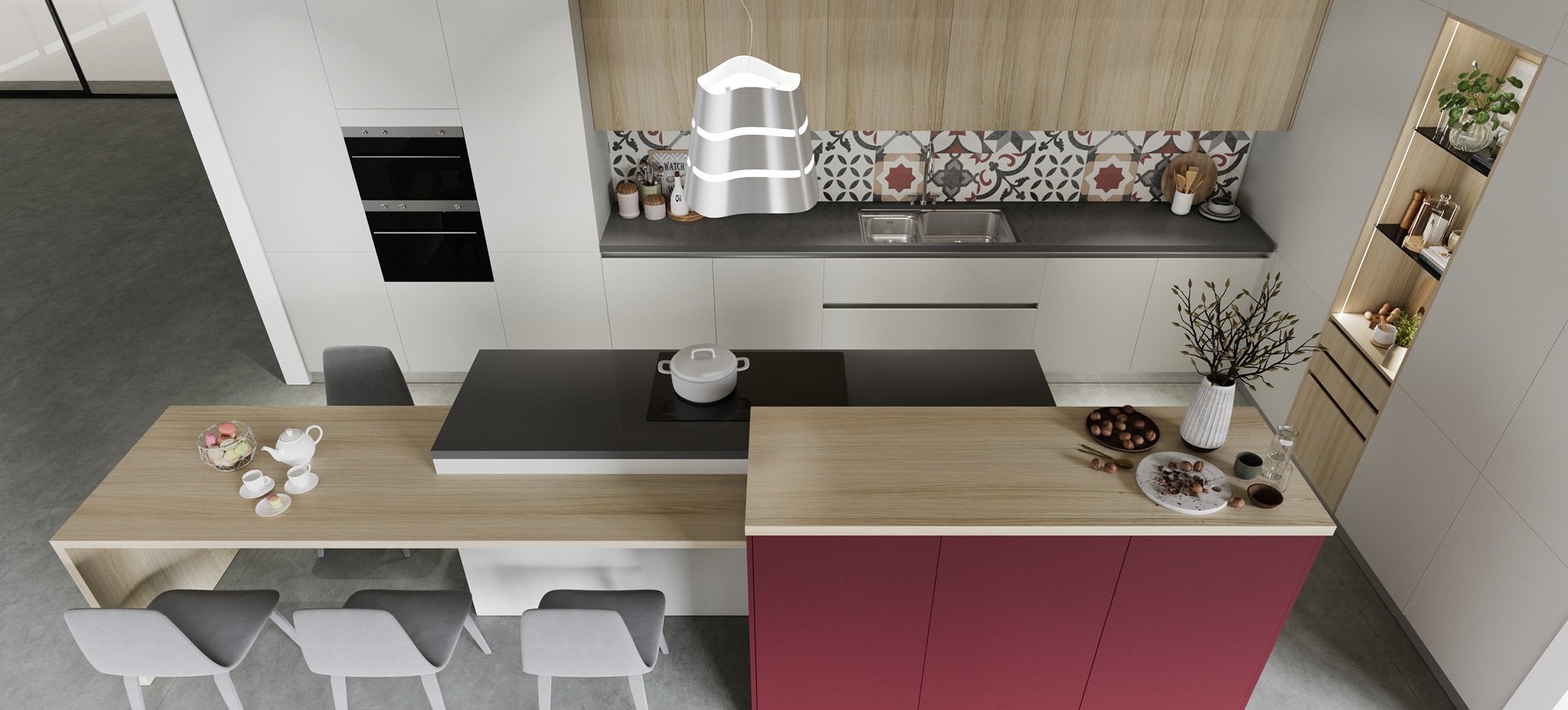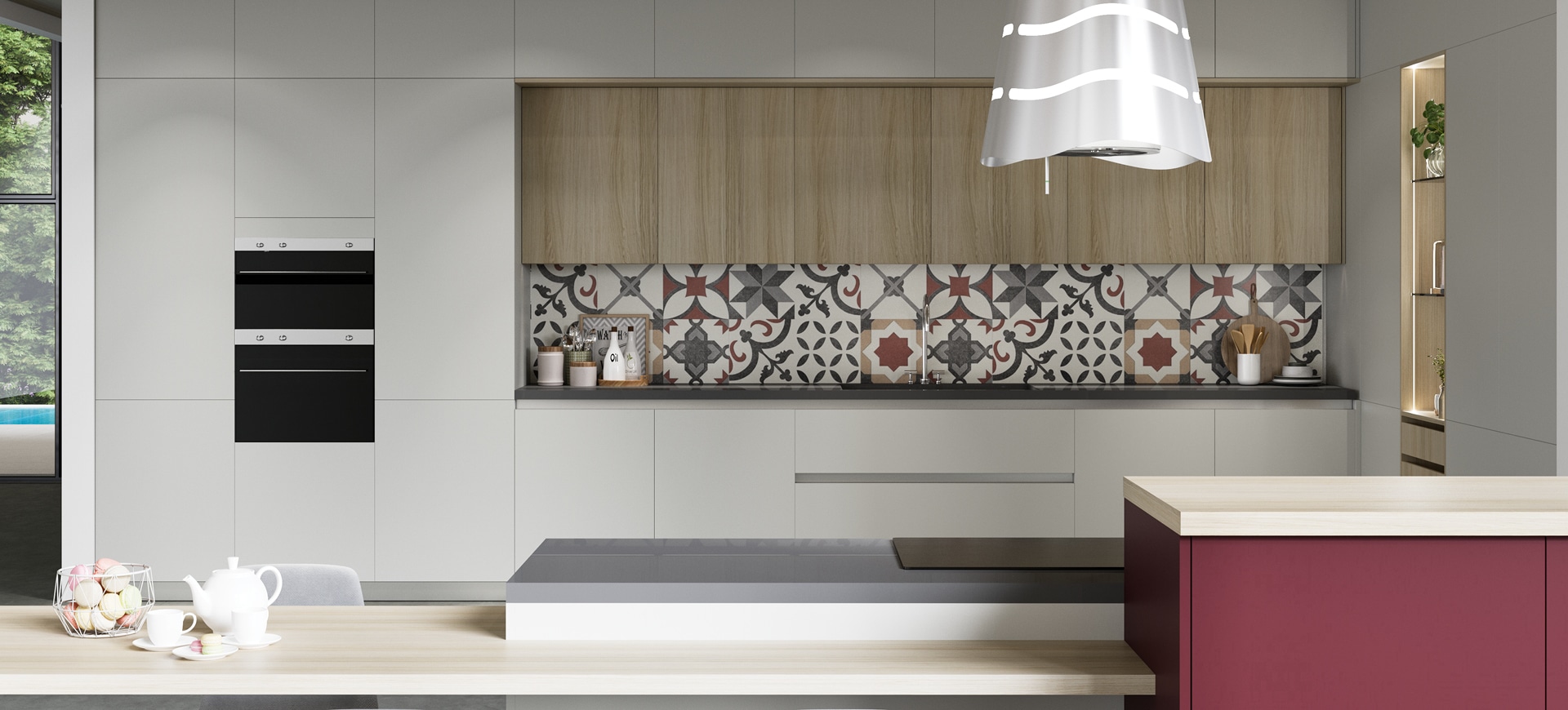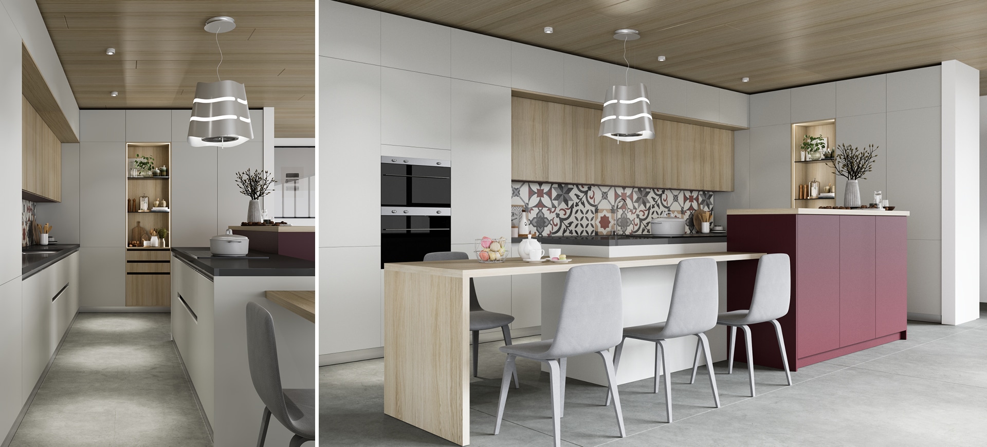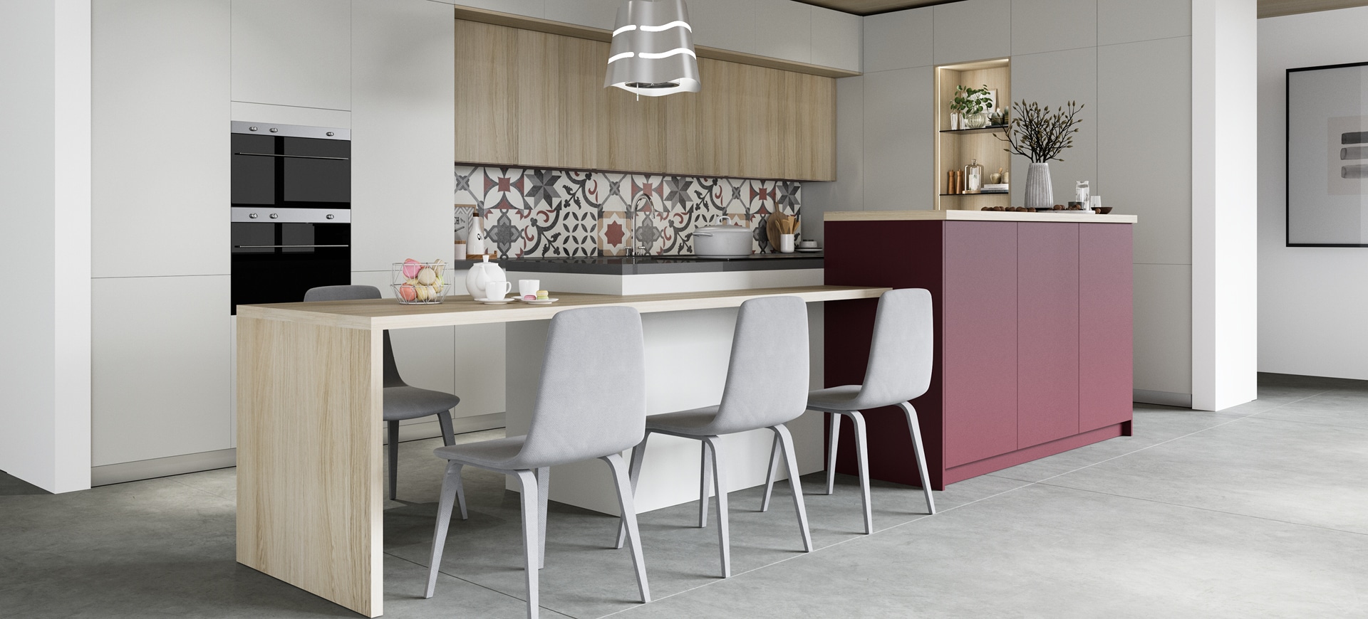 Dans la cuisine Macaron, l’esthétique moderne prévaut, par l’agencement de couleurs et de textures ! L’insertion du bois chaude avec les tons neutres de la laque offre une harmonie chaleureuse, tandis que la touche de violet aux armoires semi-hautes de l’îlot donne un accent intense et dynamique !