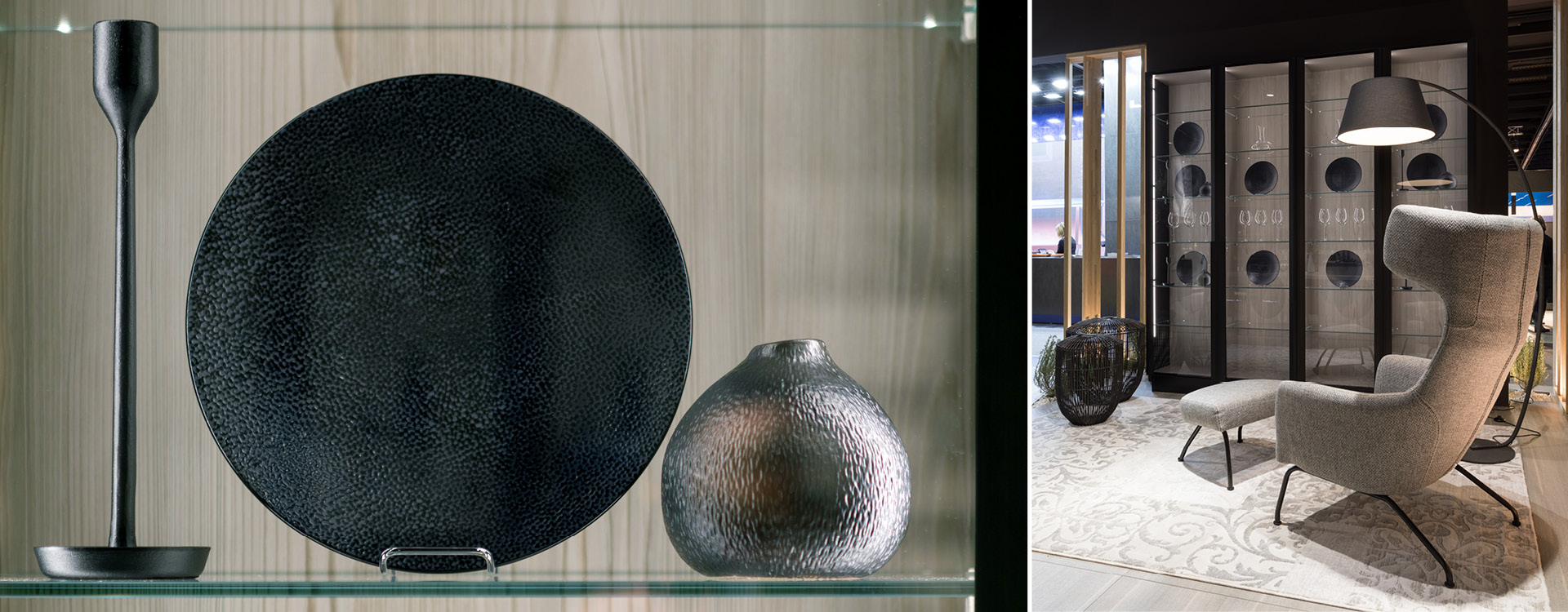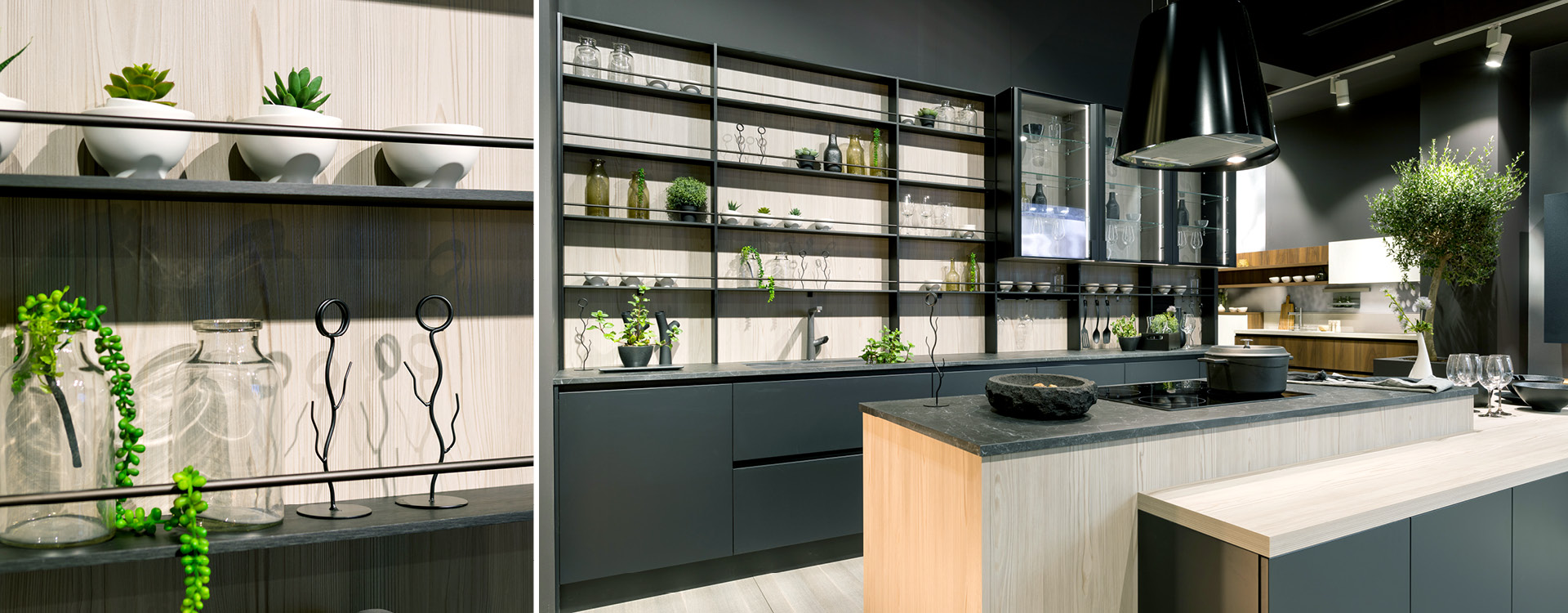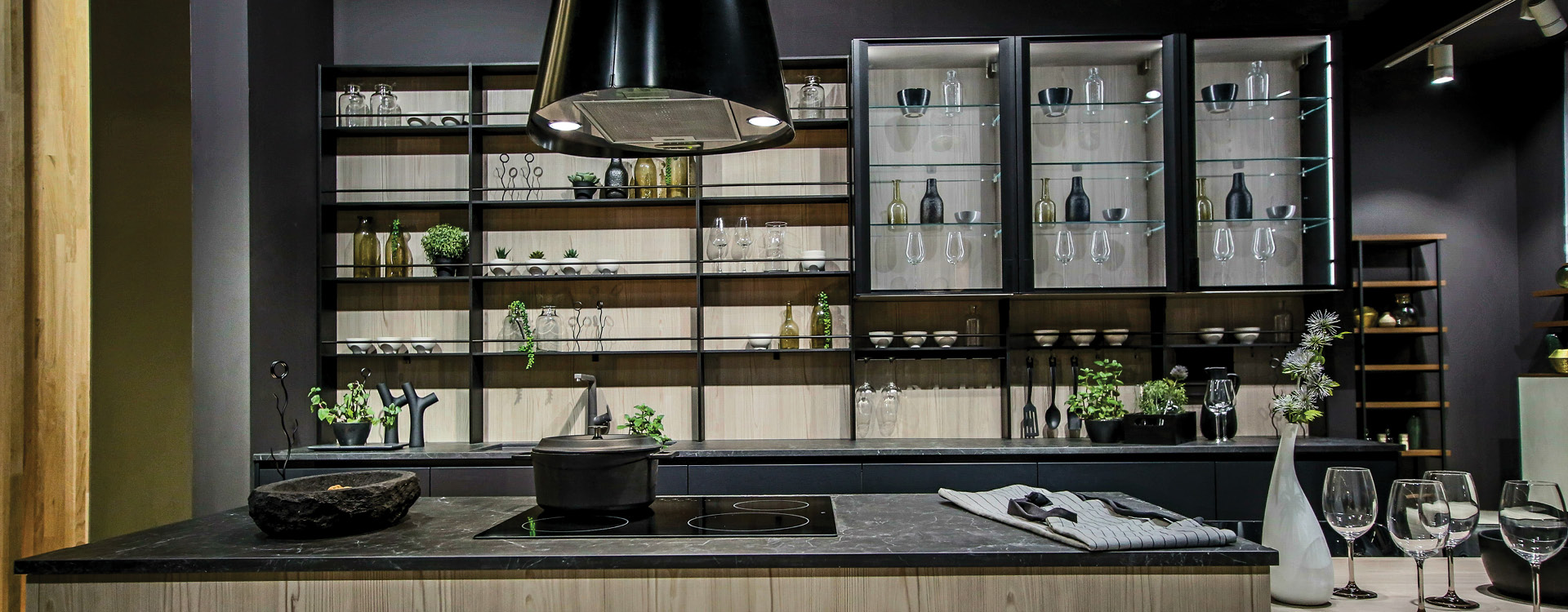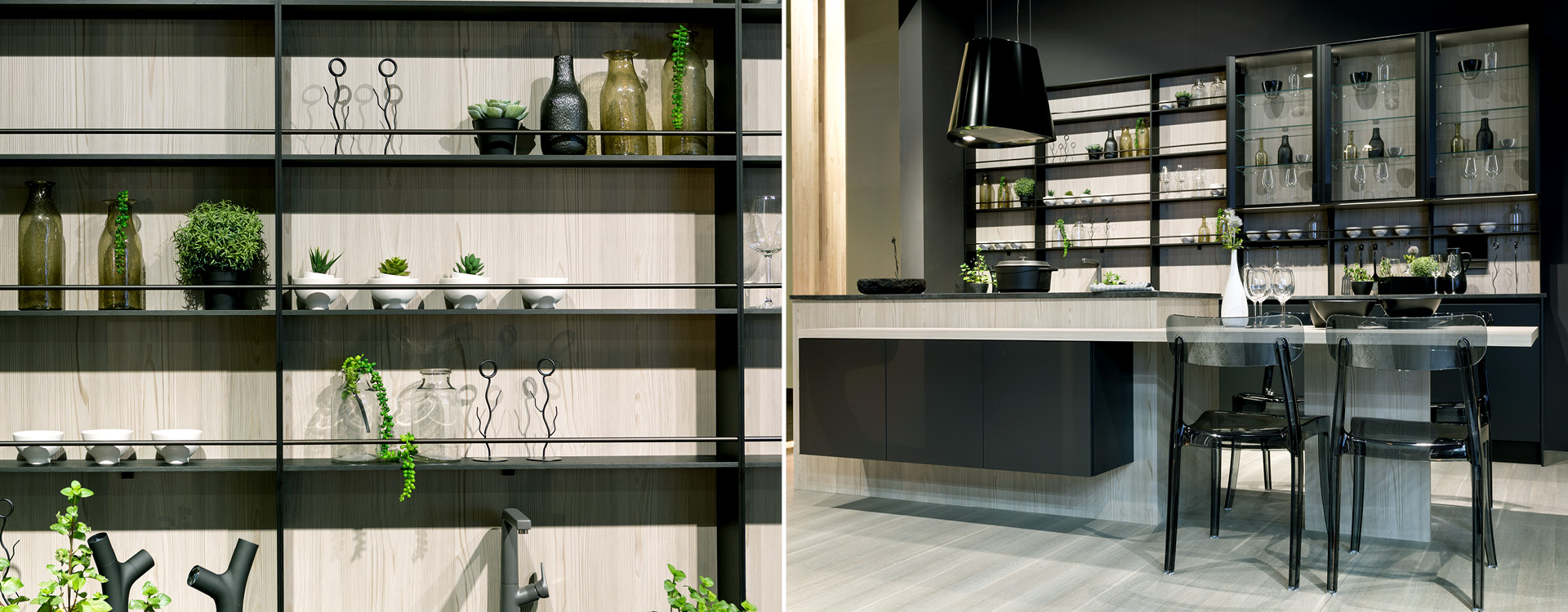 Texture, couleur, et éclairage réveillant nos envies créatives! Le laqué anthracite mat se marie parfaitement avec la couleur du bois, alors que les étagères et les cadres de portes vitrées en métalliques dynamisant l espace, créent une ambiance chaleureuse et donnent l impression d’un bar a vin chique.