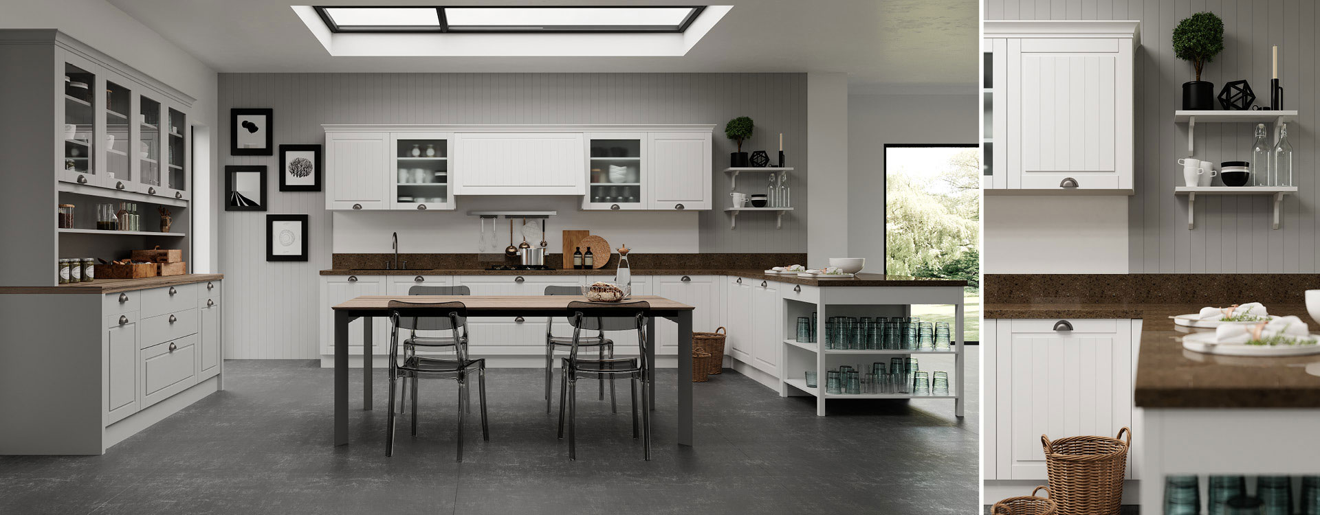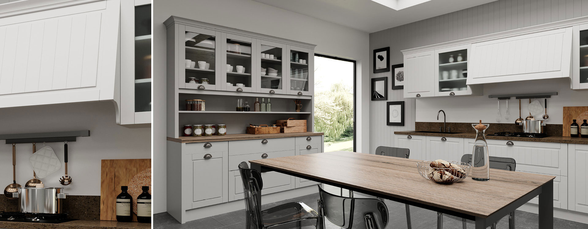 Exclusivement conçu pour ce style de cuisine, une hotte décorative, contribue à l’esthétique et à la fonctionnalité de l’espace. L’ajout d’accessoires de cuisine haut de gamme, tels que le système de tiroirs Blum legrabox, «  le mans », magic corner et d’autres mécanismes spéciaux, qui  transforment votre cuisine en un espace fonctionnel  que vous aimerez utiliser.